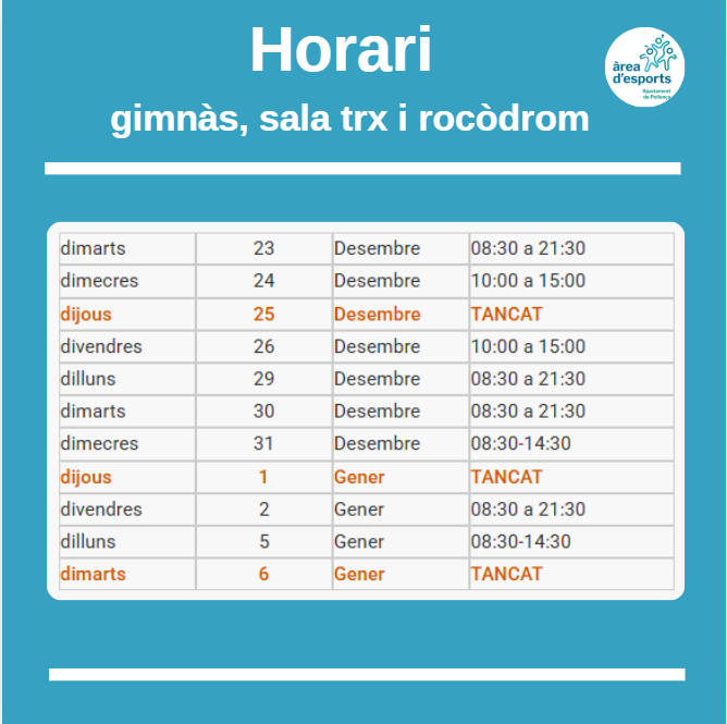 Horari gimnàs, sala trx i rocòdrom festius nadal 2025/2026